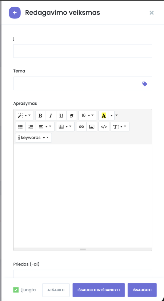 {appointment_start_time},{customer_full_name}), kurie automatiškai užpildomi realiais duomenimis. - Pridėti priedus (pvz. sąskaitas faktūras, jei naudojate Invoice modulį).