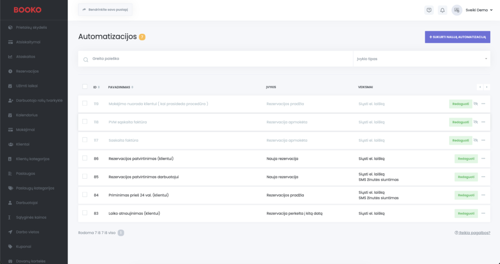 Tik prisijungus prie BOOKO jau rasite 7 sukurtas automatizacijas, kurias galite palikti kokios yra, arba jas koreguoti: