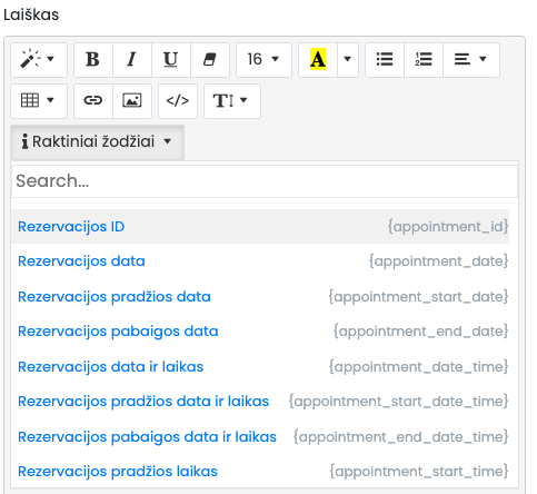 Kuriant automatizaciją, galite naudoti raktažodžius, kurie automatiškai įterpia kliento, rezervacijos ar darbuotojo duomenis. Pvz.: