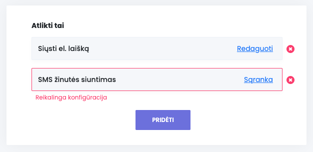 Toliau pasirinkite, ką sistema turi atlikti, kai suveikia įvykis. Galimi veiksmai: