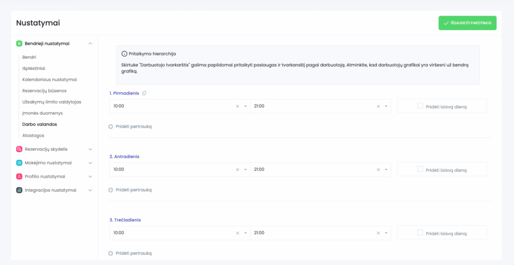 Šiame nustatymų lange galite nustatyti įmonės darbo laiką – darbo dienas, valandas, pertraukas ir poilsio dienas. Šie nustatymai užtikrina, kad klientai galėtų rezervuoti paslaugas tik tuo metu, kai verslas realiai dirba.