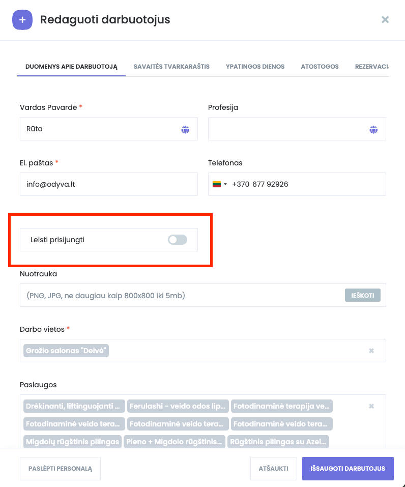 Pirmiausia eikite į Darbuotojai ir pasirinkite norimą darbuotoją. Skiltyje „Leisti prisijungti“ įjunkite šią funkciją ir išsaugokite pakeitimus.
