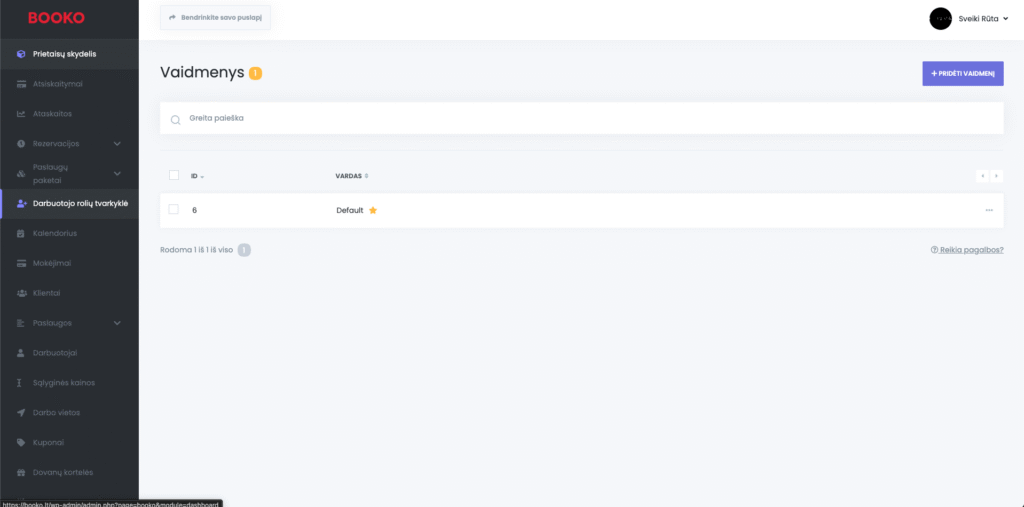 Patarimas: jei turite kelis darbuotojus su skirtingomis atsakomybėmis, sukurkite kelis vaidmenis (pvz. „Masažuotojas“, „Kosmetologė“, „Administratorius“) ir priskirkite juos atitinkamiems asmenims.