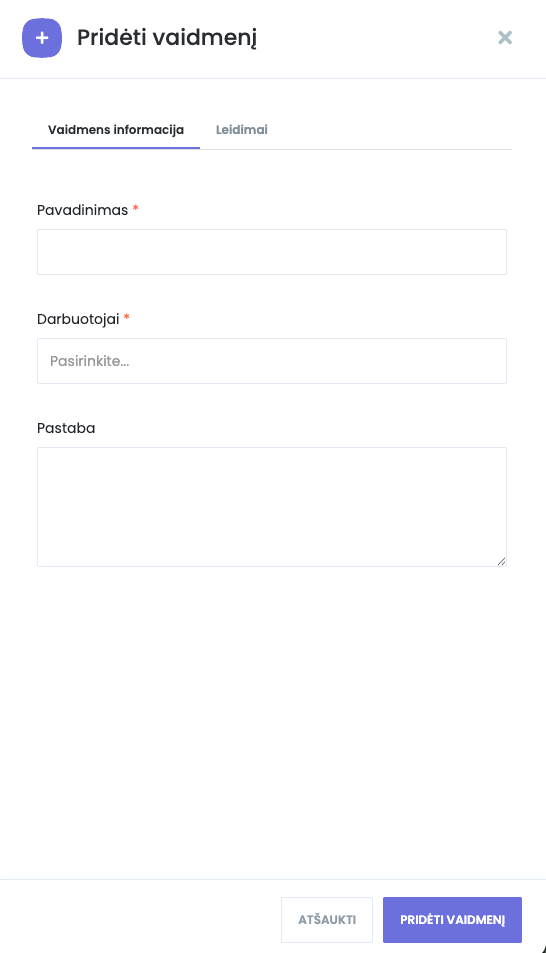 Antroje kortelėje „Leidimai“ galite nustatyti, prie kokių modulių darbuotojas turės prieigą ir ką galės daryti: