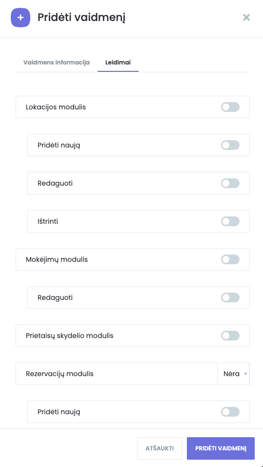 • Galite riboti prieigą prie konkrečių modulių: lokacijos, mokėjimų, rezervacijų, paslaugų ir kt.