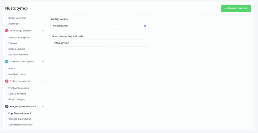 - Siuntėjo vardas: el. pašto adresas, iš kurio bus siunčiami visi automatiniai laiškai (pvz., rezervacijos patvirtinimai, priminimai, sąskaitos faktūros ir kt.). Rekomenduojama naudoti verslo el. paštą, susietą su jūsų domenu, pvz.