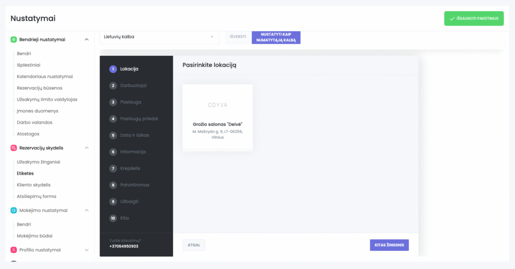 Šioje skiltyje galite valdyti visus rezervacijos proceso etikečių (tekstų) pavadinimus. Tai leidžia pakeisti, kaip sistemoje rodomi žingsnių, mygtukų ar laukų pavadinimai – pagal jūsų verslo toną ar kalbą.