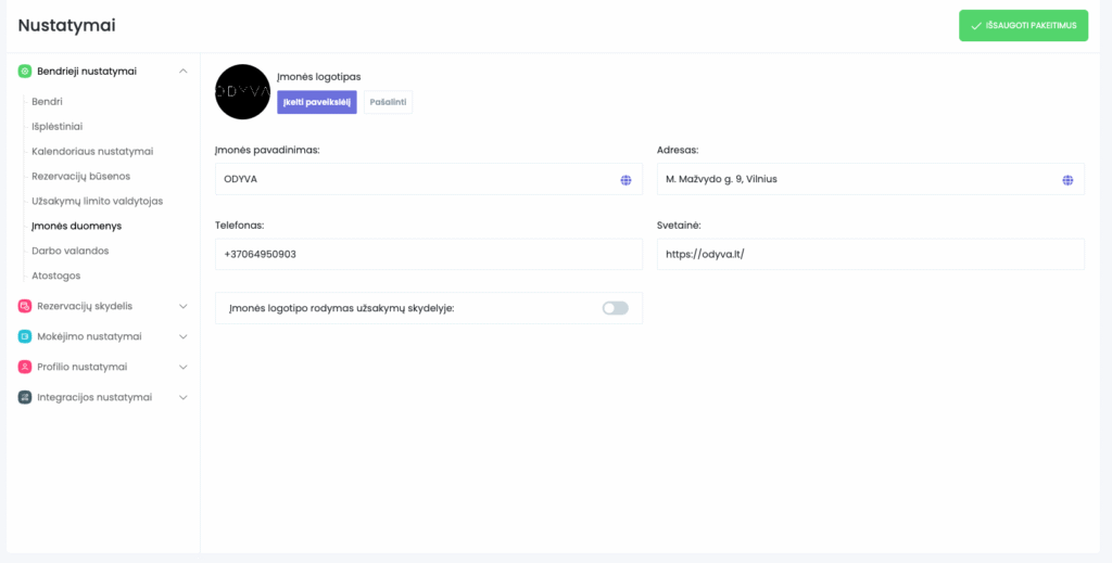 - Įmonės logotipas – įkelkite savo verslo logotipą. Jis gali būti rodomas administratoriaus skydelyje ir kliento rezervacijų lange.