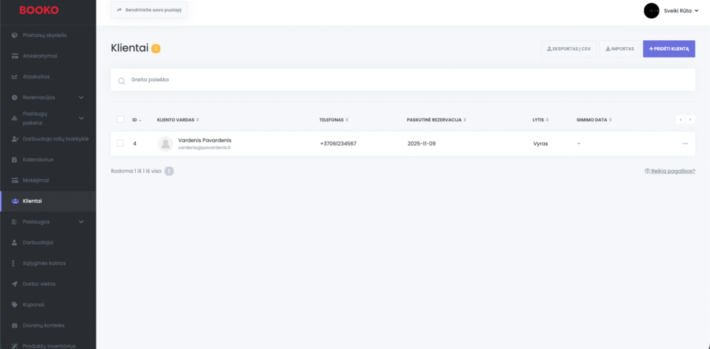 Šioje skiltyje galite pridėti naujus klientus į savo BOOKO paskyrą, matyti jų rezervacijų istoriją bei suteikti jiems prisijungimo prieigą prie asmeninės paskyros.