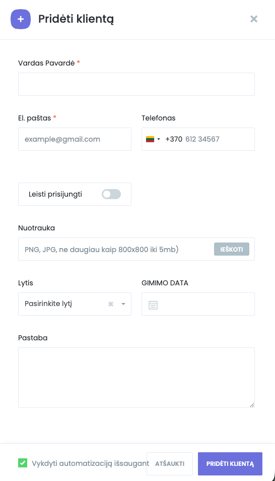 • Leisti prisijungti – jei įjungta, klientui sukuriami prisijungimo duomenys prie jo paskyros.