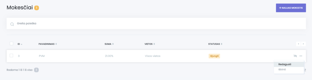Eikite į skiltį Mokesčiai, kur matysite jau sukurtą mokestį PVM. Tuomet jį redaguokite ir įjunkite.