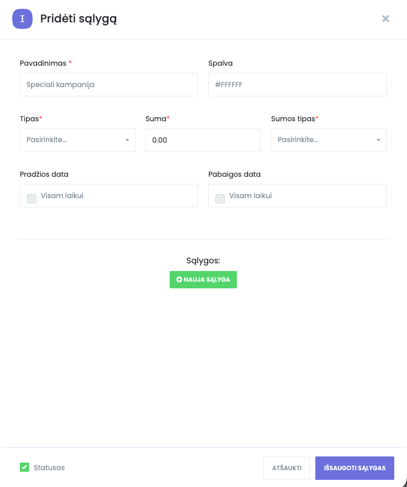 • Pavadinimas – įveskite taisyklės pavadinimą, pvz. „Savaitgalio nuolaida“ arba „Piko valandų kainos“.