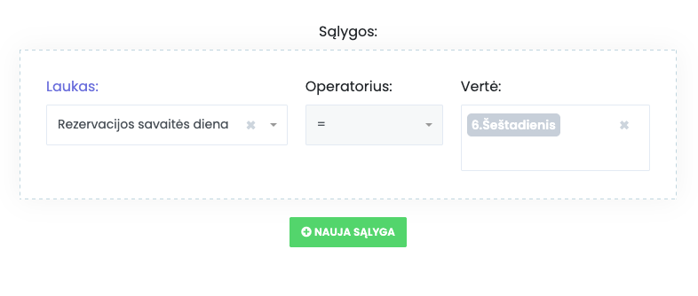 • Laukas – nustato, pagal ką bus taikoma taisyklė (pvz., vieta, paslauga, darbuotojas, data, rezervacijų skaičius ir kt.).