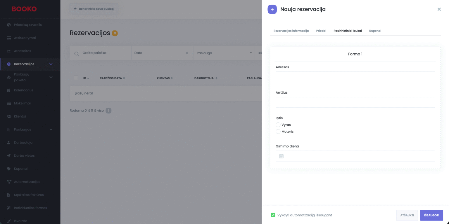 Kai klientas užpildo formą, visa informacija automatiškai perduodama į jūsų BOOKO sistemą kartu su rezervacijos duomenimis.