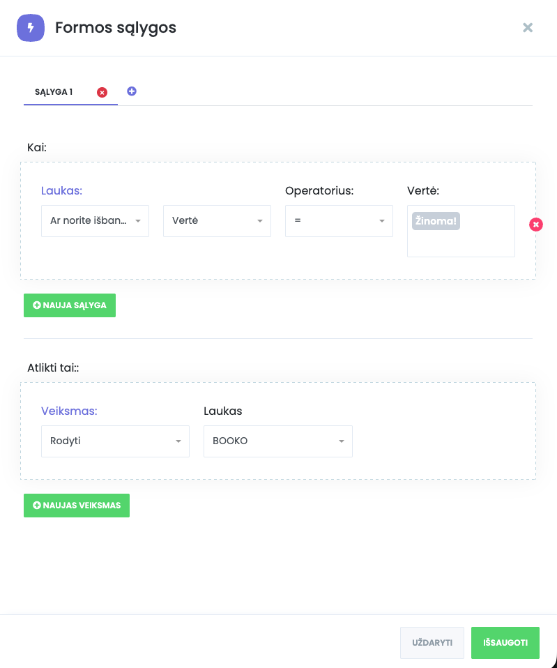 Galite nustatyti sąlygas, kad tam tikri laukai formoje būtų rodomi tik esant konkrečioms aplinkybėms. BOOKO sąlyginių laukų funkcija yra itin išsami – ji leidžia taikyti sąlygas beveik visiems laukų tipams, siūlydama daugiau galimybių nei dauguma kitų sistemų rinkoje.