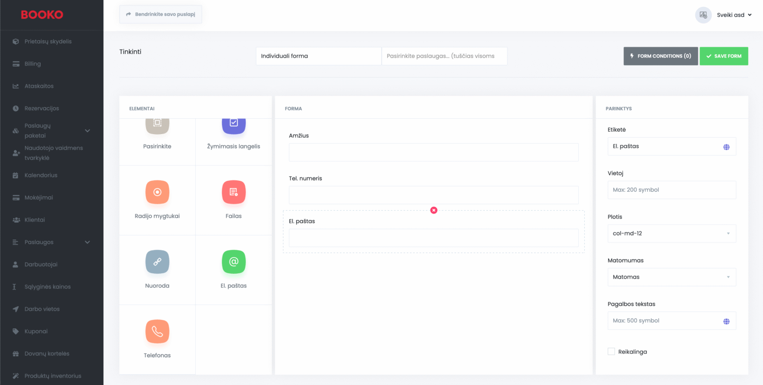 • El. paštas – galite pridėti el. pašto lauką į savo informacijos skyrių ir paprašyti kliento papildomo el. pašto adreso. Pranešimai gali būti automatiškai siunčiami į šį el. pašto adresą.