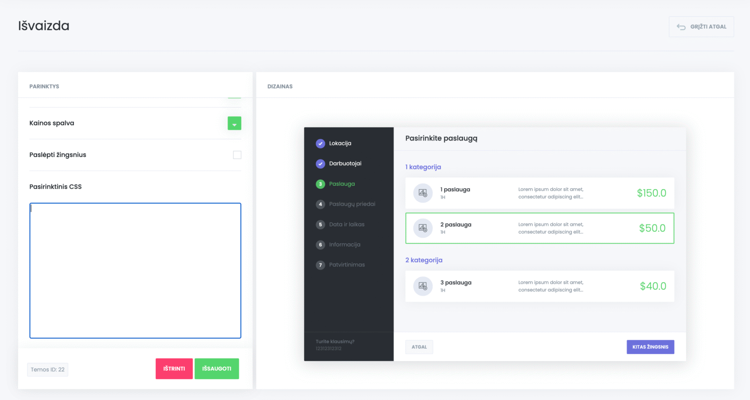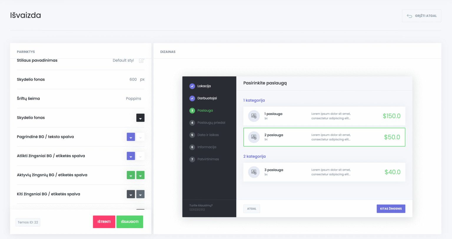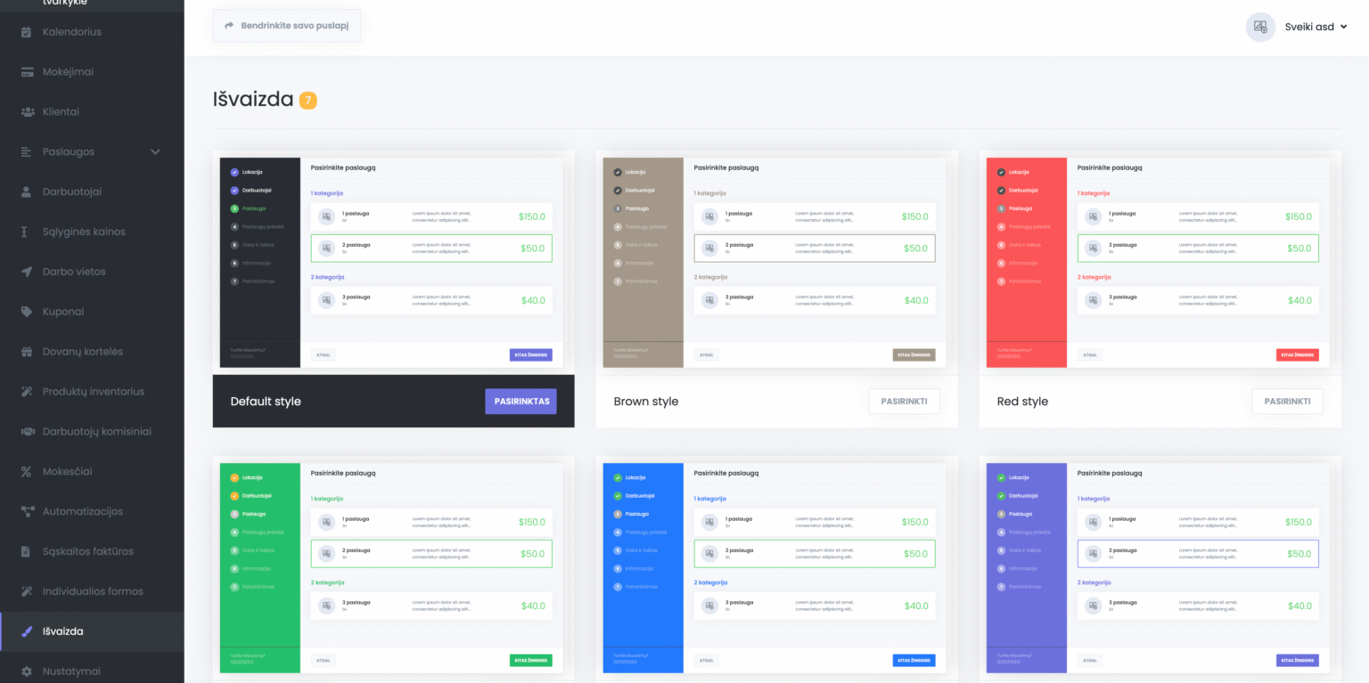 Rezervacijos formoje yra 7 žingsniai, kuriuos reikia atlikti norint užsisakyti paslaugą. Tačiau nebūtina atlikti visų žingsnių, jei tai nėra būtina. Pavyzdžiui, jei turite tik vieną vietą, darbuotoją ir pan., galite paslėpti šiuos žingsnius užsakymo formoje. Be to, galite pakeisti šių žingsnių tvarką pagal savo verslo tipą. Norėdami tai padaryti, galite rūšiuoti tvarką, paimdami perkelimo piktogramą ir traukdami ją į viršų arba į apačią. Visi šie rūšiavimo pakeitimai nesudarys papildomų sunkumų sistemai. Jei darbuotojų pasirinkimo žingsnis yra pirmasis, o paslauga – antrasis, po darbuotojų pasirinkimo bus rodomos tik šiam darbuotojui priklausančios paslaugos, o pasirinkus paslaugą, bus rodomi tik tą paslaugą teikiantys darbuotojai. Tą patį galime pasakyti apie žingsnį „Data ir laikas“. Pasirinkus bet kurią datą, rezervacijų skydelyje bus rodomi tik tą dieną dirbantys darbuotojai. Jei kuris nors žingsnis jums nereikalingas, galite jį išjungti, tik datos, laiko ir informacijos žingsnio išjungti negalima, bet visus kitus užsakymo žingsnius galite paslėpti.